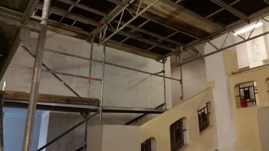 | Im Schulhaus ist ein Gerüst aufgestellt worden. Die Malerarbeiten in den hohen Bereichen beginnen.